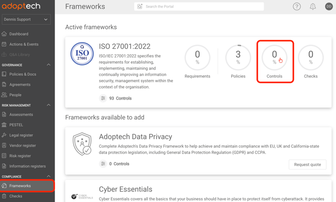 Controls can be accessed from the Frameworks page and by selecting the Controls dials as shown below.