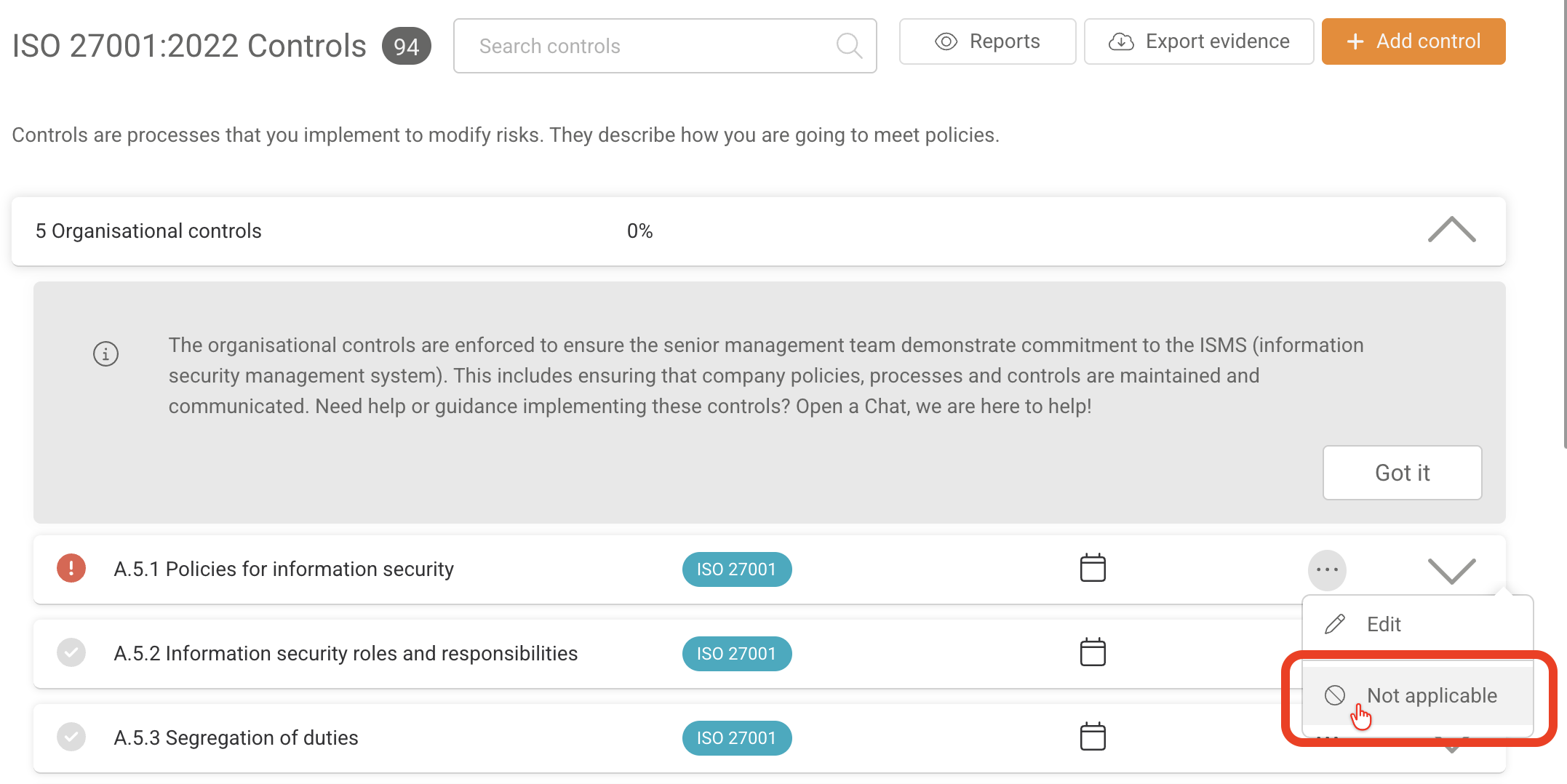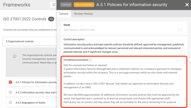 Have a look at some of the suggested compliance procedures in the Adoptech created controls. In the example below we have ISO 27001 Framework and Control A.5.1.