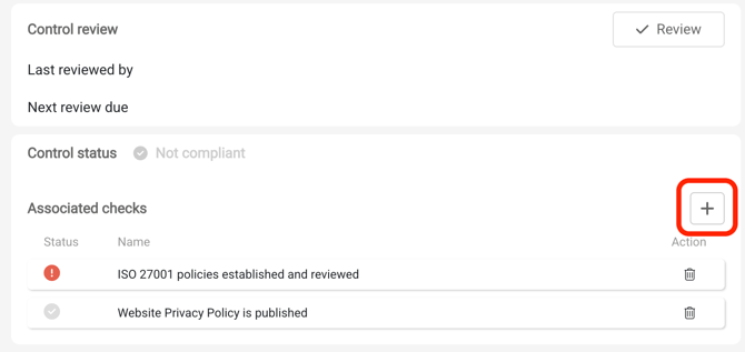 Additional checks can be linked to a Control using the + Add button. Note that checks must be initially created via the Checks Page, accessible from the left hand side menu. To remove the link between a control and a check, select "Remove from control" from the menu on the right hand side.