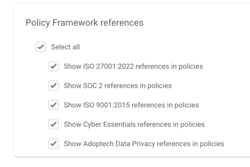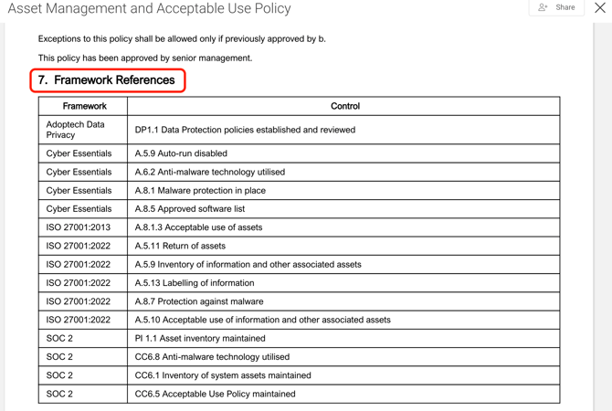 The Framework Reference is the final section of a policy, detailing all the controls associated with it. For instance, in the context of the policy below, Framework References would include the controls as shown on the image below.