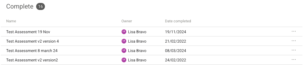 - Under the Complete section you will see assessments that have been sent out and all responders have submitted their responses.