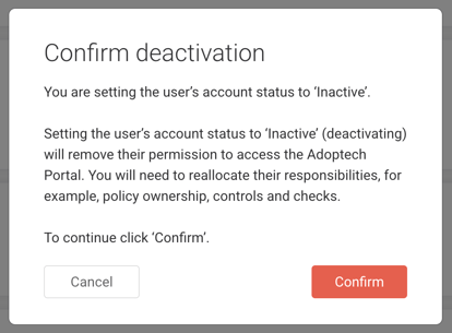 - You will need to confirm you want to set the user's account as 'Inactive'. The user will be removed from ownership of any compliance responsibilities such as registers or risks and will no longer be available for selection to add for these responsibilities.