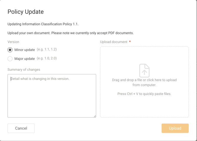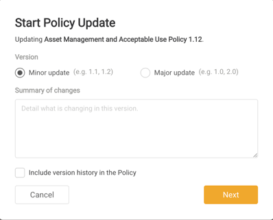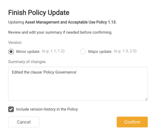When you're done, a Finish Policy Update modal will appear for you to confirm the version details before submitting for approval.