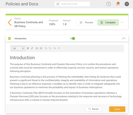Include version history in the policy (optional). Tick this to append a version history table to the end of the policy document, showing all previous versions, their change summaries, and approval dates. Useful for auditors and standards that require documented version trails.
