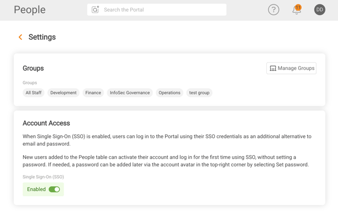 - Under Account access, toggle SSO on or off.