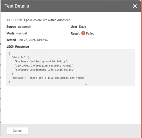 When you run a test "ISO 27001 policies are live within Adoptech" you may get an error saying "There are 'x' live documents not found'.