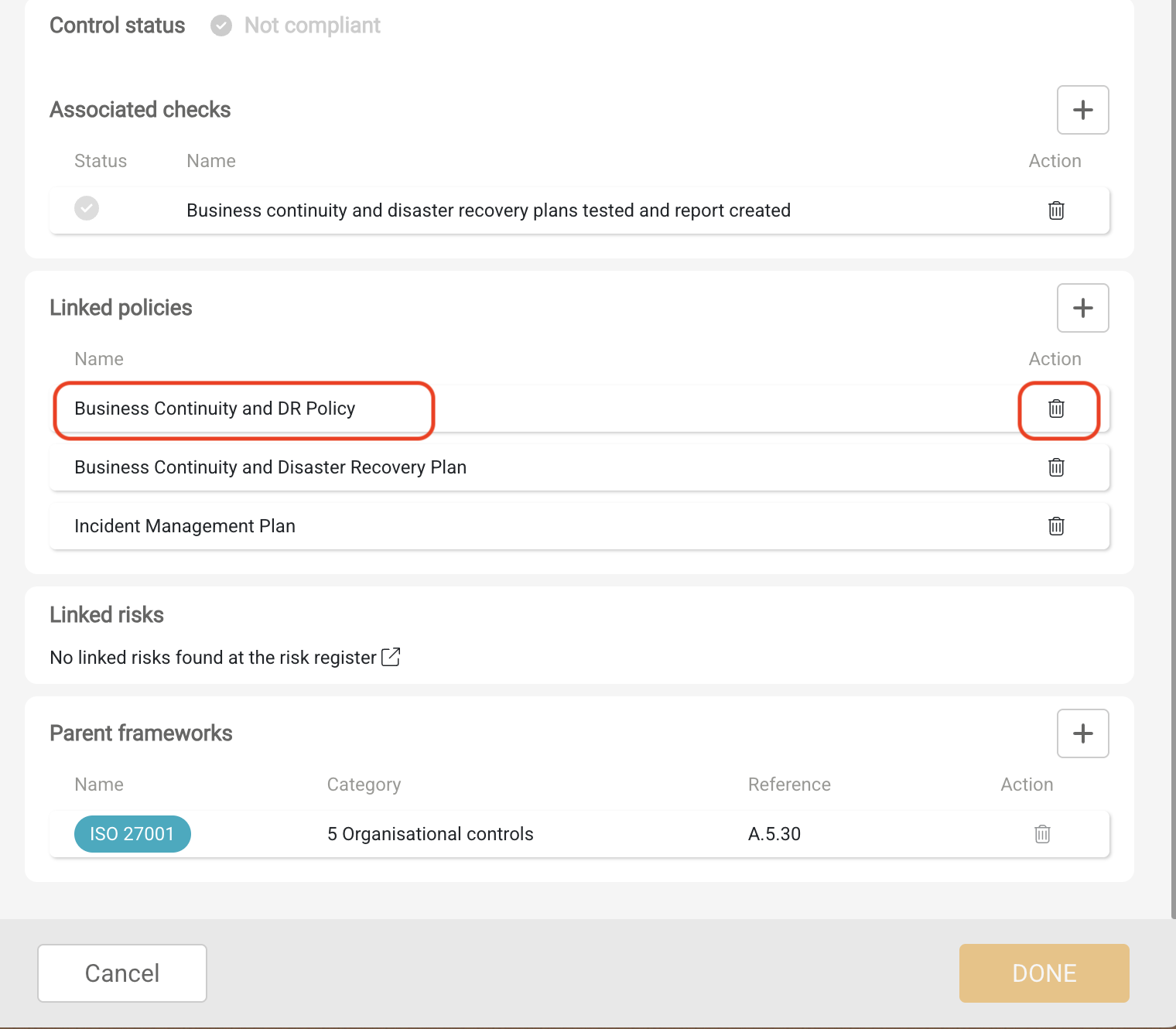 5. Find your policy and click the bin icon to unlink it and remove from this control