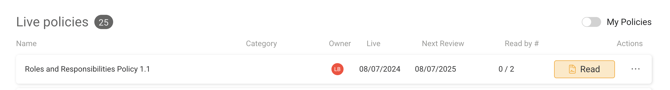 1. Users will see the policy appear in the Live table on the Policies and Docs page. There will be an orange Read button appear on the right hand side. The user should click on this button to attest that they have read the policy.