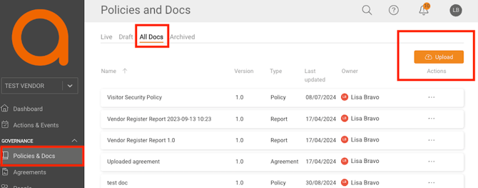 1. Click on the Policies & Docs page in the Left hand menu and select the All Docs tab.