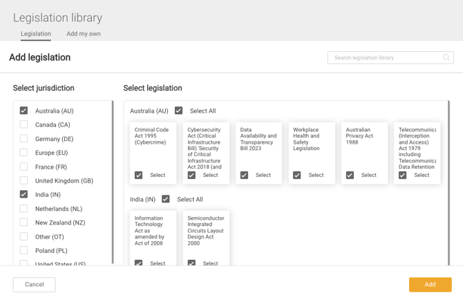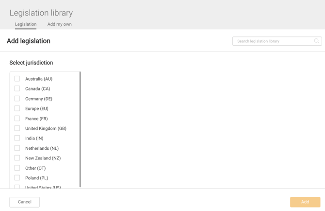 The Adoptech legal register has a library of available legislation across many jurisdictions that you can simply add to the register. If you don't find the legislation you require, you can simply add your own.