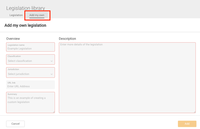 Select Legal register from the left hand-side menu and click on +Add new/Legislation